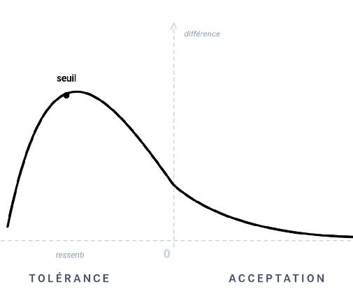 La "différence" varie, elle, sur un second axe verticalement ; alors dans ce repère (ah ! le bon temps du collège) le "ressenti de la différence" dessine une courbe. D'un premier côté, progressivement elle s'aplatit -au propre et au figuré- dans l'acceptation, tandis que, du second côté, (c'est là que se trouve, en fait, la tolérance) elle se développe puis chute brutalement à un seuil.